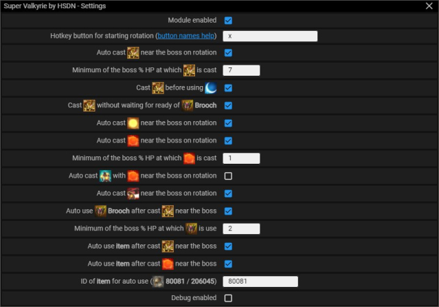 Полный быстрой каст для валькирии с удобной панелью управления и дальнейшим авто-обновлением. Модуль быстро выдает всю ротацию с топ хпмами пока вы удерживаете одну кнопку. Используется стандартная легитная ротация, поэтому не возникает подозрения на использование читов. Модуль быстро анализирует и подстраивается под ваш пинг на любом поддерживаемом сервере и не требует какой-либо настройки.