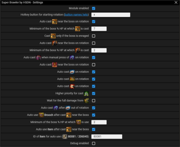 Полный быстрой каст для крушителя с удобной панелью управления и дальнейшим авто-обновлением. Модуль быстро выдает всю ротацию с топ хпмами пока вы удерживаете одну кнопку. Работает как в позиции дд, так и в позиции танка (быстро прожимает рагу и агро при отагре). Модуль быстро анализирует и подстраивается под ваш пинг на любом поддерживаемом сервере и не требует какой-либо настройки.