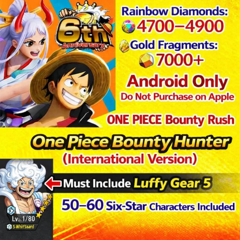 Краткое описание: ⬛🟥Глобал🟥⬛Android⬛🟥Luffy Gear 5🟥⬛4700+ Алмазов⬛🟥7000+ золотых фрагментов🟥⬛50-60+ рандом 6⭐⬛🟥Подробное описание: 🎁Глобал