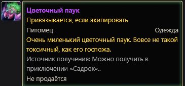 Подробное описание: Очень миленький цветочный паук. Вовсе не такой токсичный, как его госпожа. Можно посмотреть в гардеробе в разделе питомцы.
