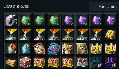 Много приятных плюшек и расходок: американо енота, пве конфеты, женьшень, знаки арены, знаки триумфа, кристаллы битвы, маг камни, усилки, точки, ген гс, гс парал, купон на смену внешки, ап, 500руб на балансе.