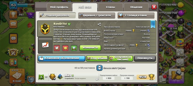 Краткое описание: 💎🖤 АКТИВНЫЙ КЛАН 14 ЛВЛ 🖤💎 7 СТОЛИЦА 💎🖤 ЛИГА ЗОЛОТО 1 🖤💎 ОЧКОВ 28400 💎🖤