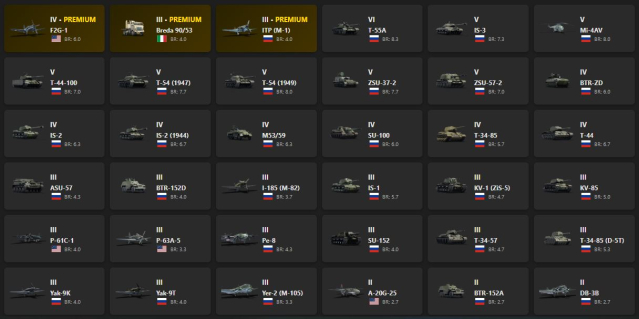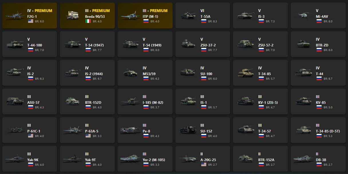 F2G-1, Breda 90/53, T-55A, IS-3, Mi-4AV, T-44-100, T-54 (1947), T-54 (1949), ZSU-37-2, ZSU-57-2, BTR-ZD