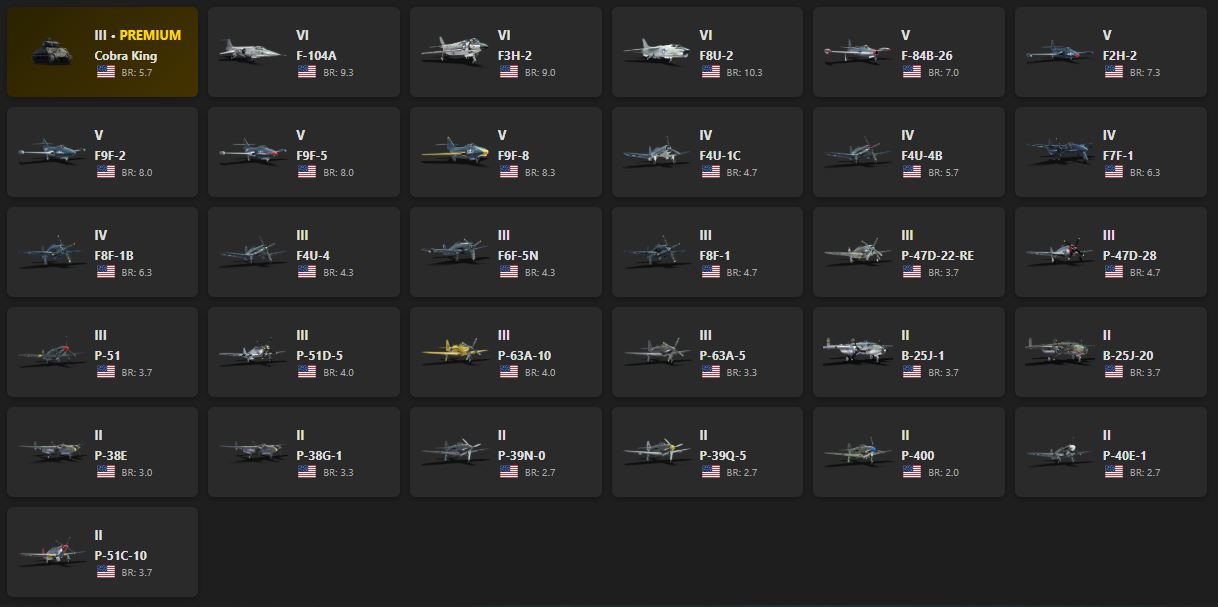 Cobra King, F-104A, F3H-2, F8U-2, F-84B-26, F2H-2, F9F-2, F9F-5, F9F-8, F4U-1C, F4U-4B, F7F-1, F8F-1B