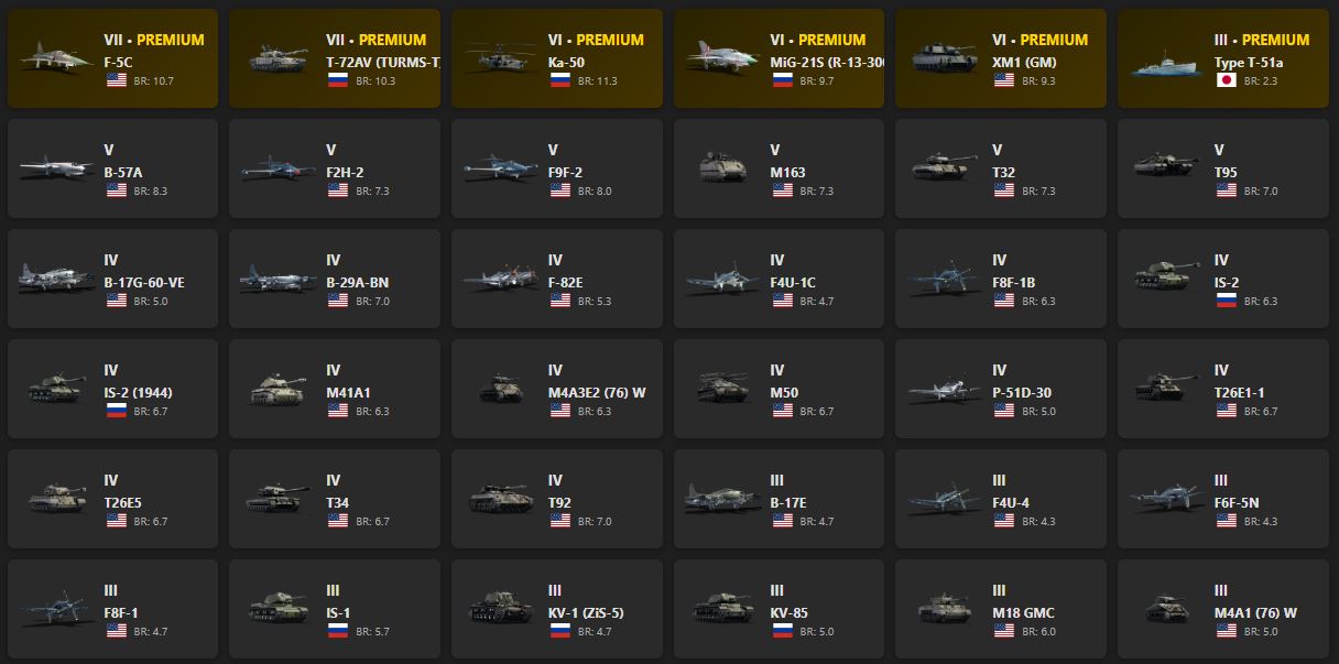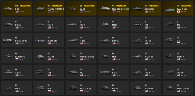 F-5C, T-72AV (TURMS-T), Ka-50, MiG-21S (R-13-300), XM1 (GM), Type T-51a, B-57A, F2H-2, F9F-2, M163, T32