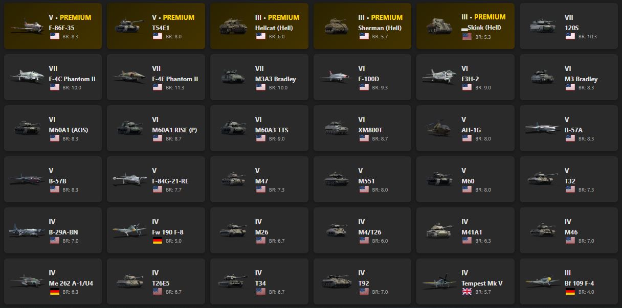 120S, F-86F-35, T54E1, Hellcat (Hell), Sherman (Hell), Skink (Hell), F-4C Phantom II, M3A3 Bradley, F-100D, F3H-2