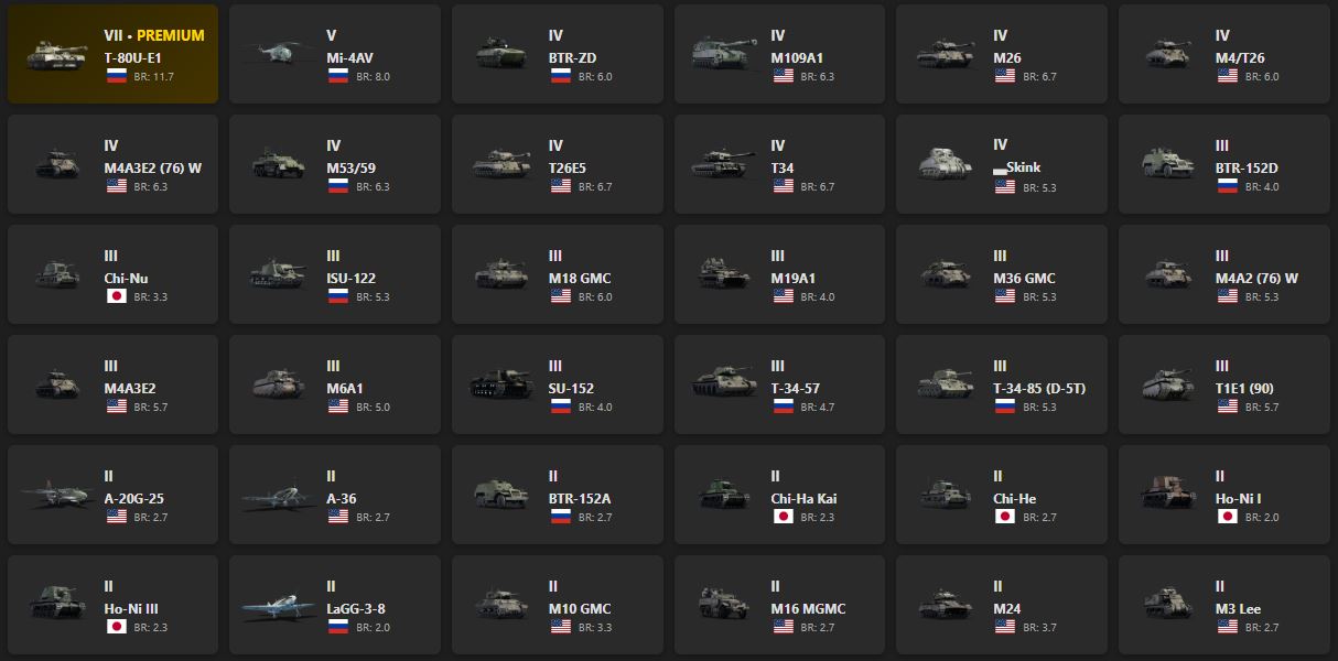 Т-80U-Е1, Mi-4AV, BTR-ZD, M109A1, M26, M4/T26, M4A3E2 (76) W, M53/59, T26E5, T34, Skink, BTR-152D