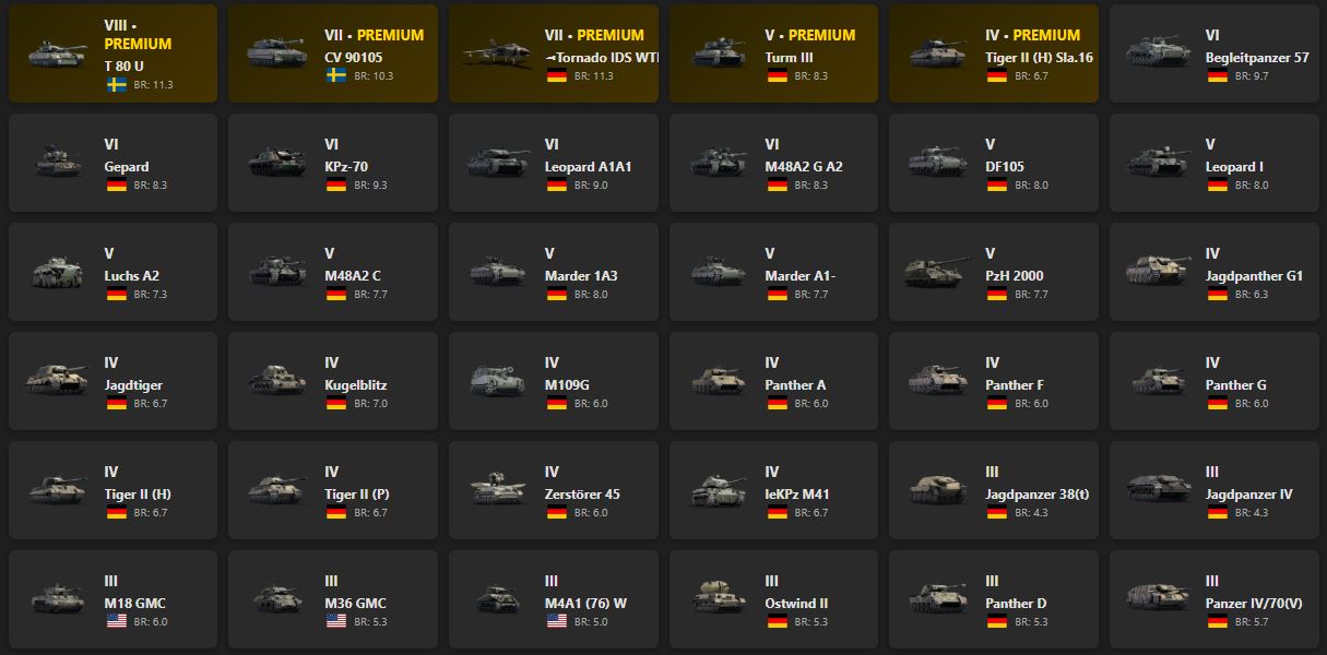 T 80 U, CV 90105, Tornado IDS WTD61, Turm III, Tiger II (H) Sla.16, Begleitpanzer 57, Gepard, KPz-70