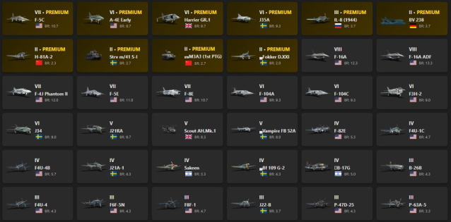 F-16A, F-16A ADF, F-5C, A-4E Early, Harrier GR.1, J35A, F-4J Phantom II, F-5E, F-8E, F-104A, J34, J21RA