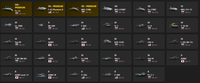 Su-33, F-4S Phantom II, MiG-23ML, MiG-21SMT, Su-17M2, MiG-21F-13, Su-7BKL, Mi-4AV, F-82E