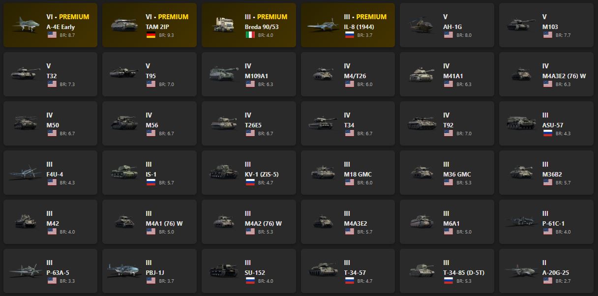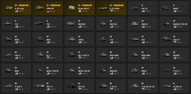 A-4E Early, TAM 2IP, Breda 90/53, IL-8 (1944), AH-1G, M103, T32, T95, M109A1, M4/T26, M41A1