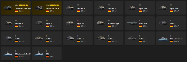 Leopard A1A1 (L/44), Panzer IV/70(A), Panther F, Panther G, Tiger II (H), Tiger II (P), Panther D, Waffenträger