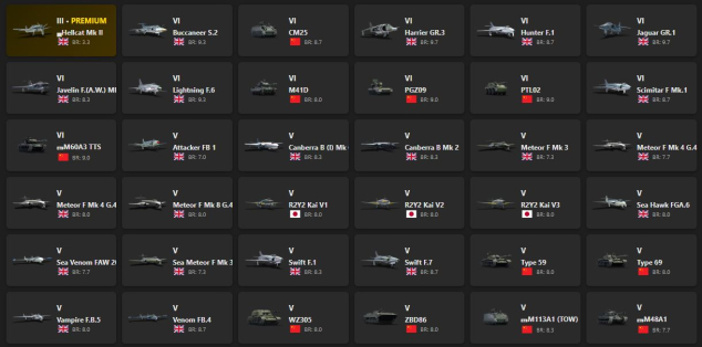 Buccaneer S.2, CM25, Harrier GR.3, Hunter F.1, Jaguar GR.1, Javelin F.(A.W.) Mk.9, Lightning F.6, PGZ09, PTL02