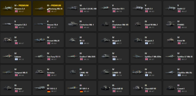 Wyvern S.4, Javelin F.(A.W.) Mk.9, Attacker FB 1, Swift F.1, Swift F.7, Vampire F.B.5, Venom FB.4