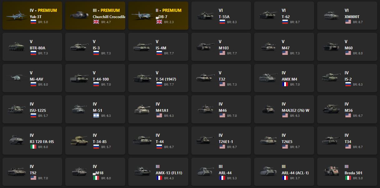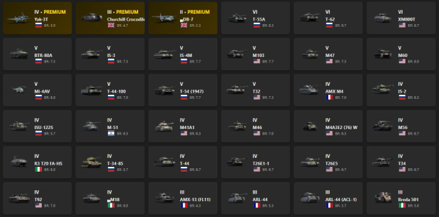 Yak-3T, Churchill Crocodile, T-55A, T-62, XM800T, BTR-80A, IS-3, IS-4M, M103, M47, M60, Mi-4AV