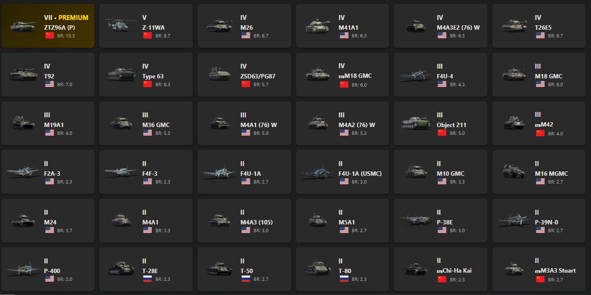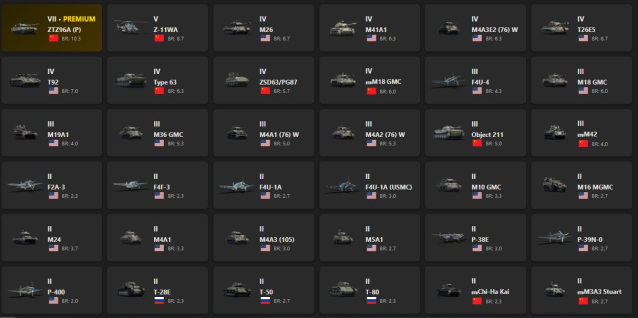 ZTZ96A (P), Z-11WA, M26, M41A1, M4A3E2 (76) W, T26E5, T92, Type 63, ZSD63/PG87, M18 GMC, F4U-4