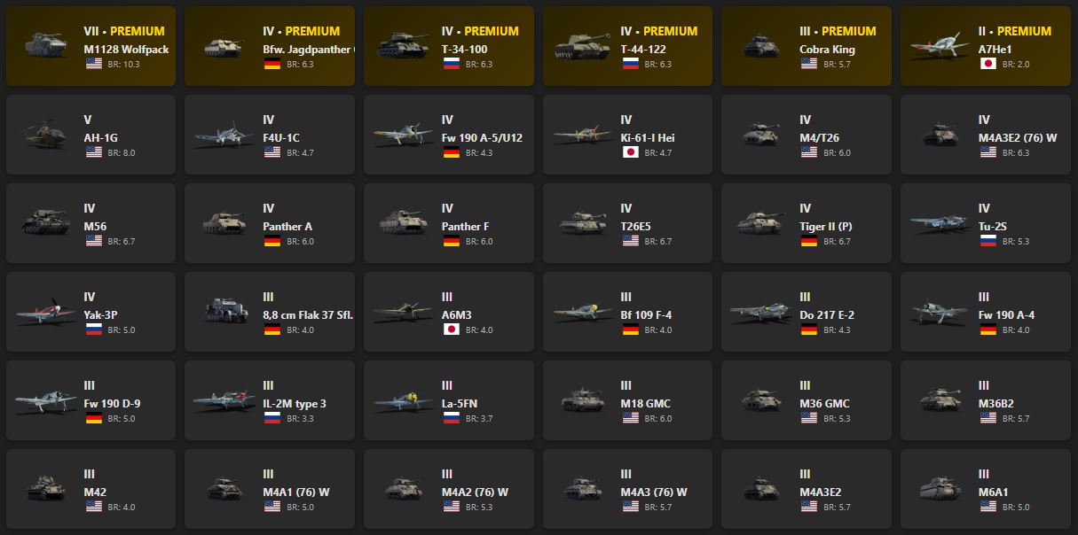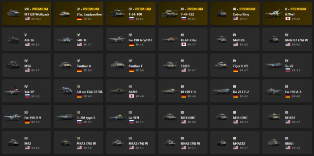 M1128 Wolfpack, Bfw. Jagdpanther G1, T-34-100, T-44-122, Cobra King, A7He1, AH-1G, F4U-1C, Fw 190 A-5/U12