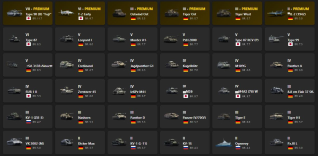 Type 90 (B) "Fuji", T-2 Early, Type 87, Leopard I, Marder A1-, PzH 2000, Type 87 RCV (P), Type 99