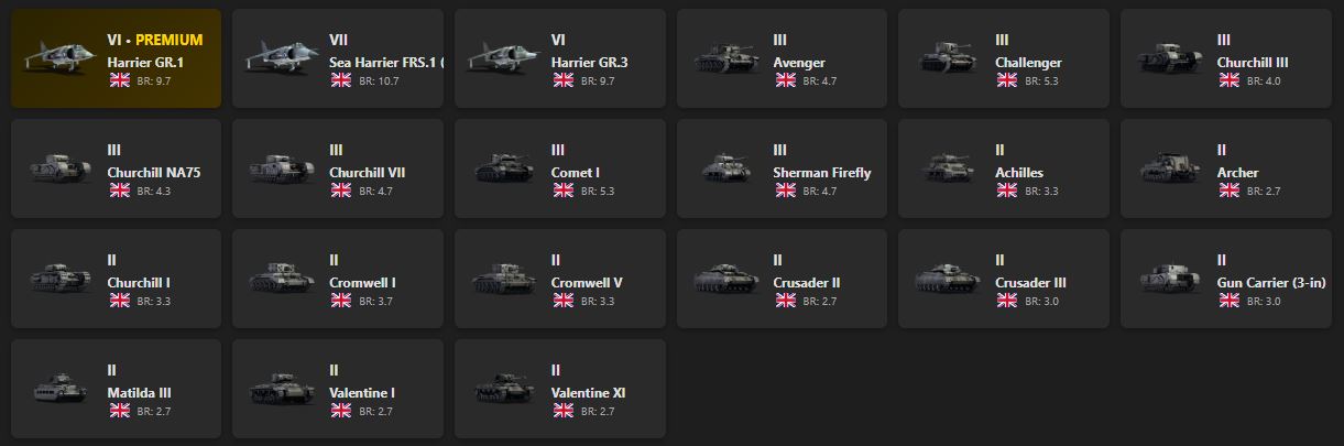Harrier GR.1, Sea Harrier FRS.1 (e), Harrier GR.3, Avenger, Challenger, Churchill III, Churchill NA75, Churchill VII, Comet I