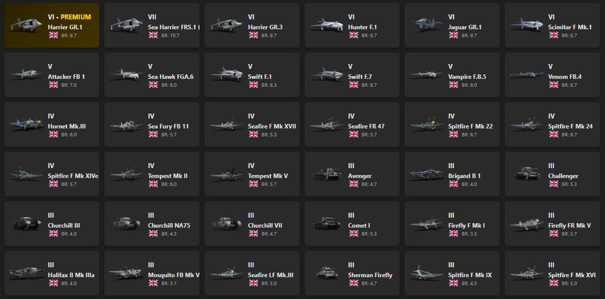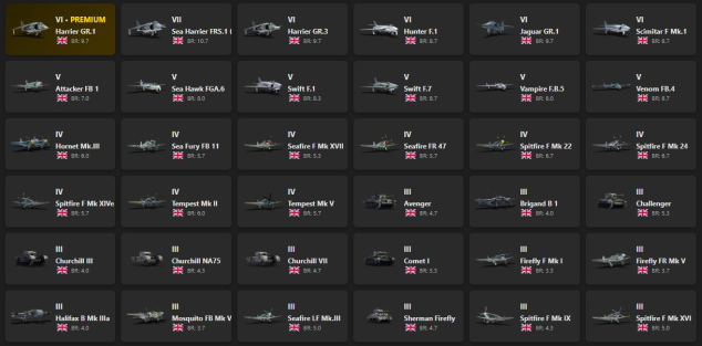 Harrier GR.1, Sea Harrier FRS.1 (e), Harrier GR.3, Hunter F.1, Jaguar GR.1, Scimitar F Mk.1, Attacker FB 1