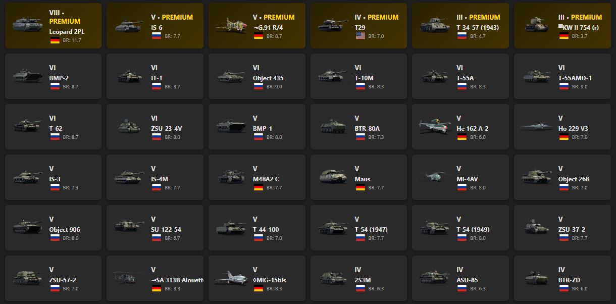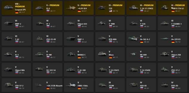 Leopard 2PL, IS-6, G.91 R/4, T29, KW II 754 (r), BMP-2, IT-1, Object 435, T-10M, T-55A, T-55AMD-1