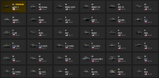 M3 Bradley, M60A1 (AOS), M60A3 TTS, MBT-70, T95E1, XM800T, XM803, AH-1G, BMP-1, BTR-80A, IS-3