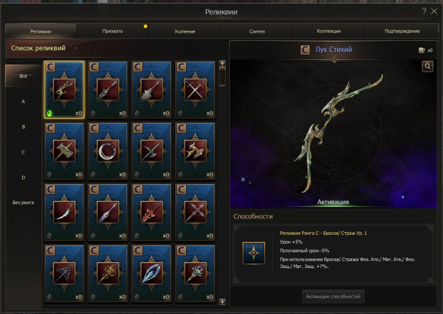 Реликвия есть Длинный меч самурая и Лук стихий ранг С урон +5% получаемый -5% При использовании лука физ атака маг атака физ защита маг защита +7%