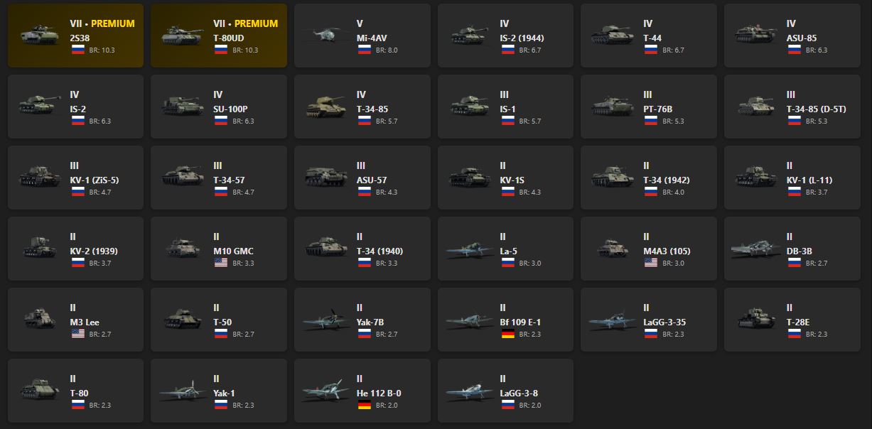 VII - 2, V - 1. 2S38, T-80UD, Mi-4AV, IS-2 (1944), T-44, ASU-85, IS-2, SU-100P, T-34-85, IS-1, PT-76B