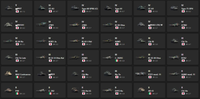 V - 1. M47, ST-A3, Type 60 SPRG (C), Type 61, ST-A1, Type 75 SPH, M41A1, J7W1, J2M3, Ki-84 Otsu