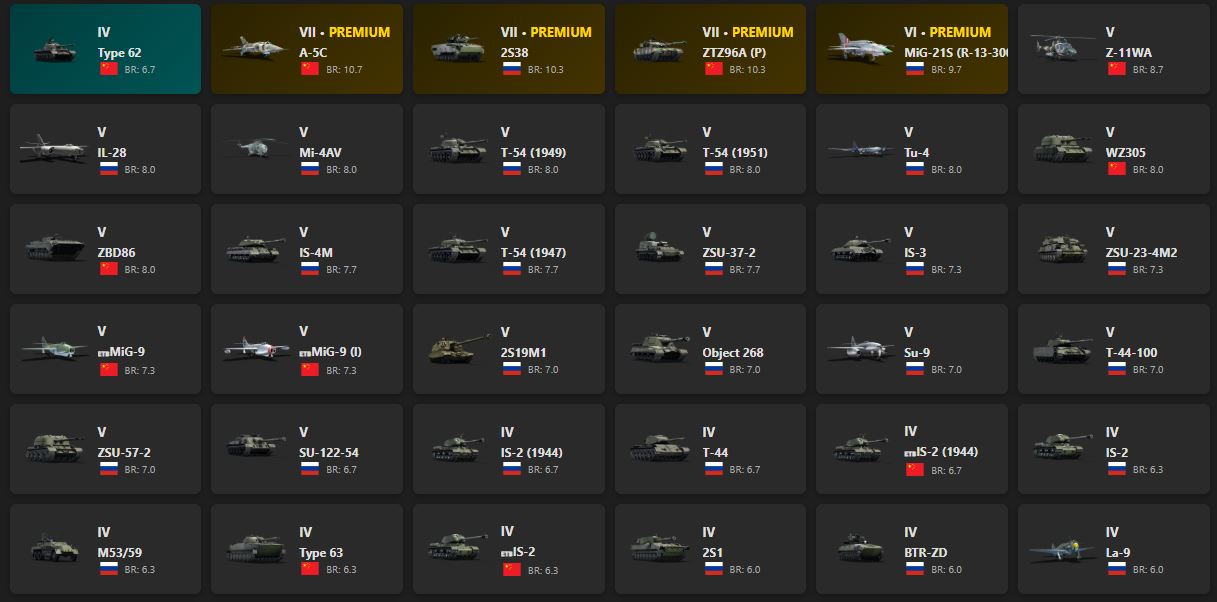 VII - 3, VI - 1, V - 21. Type 62, A-5C, 2S38, ZTZ96A (P), MiG-21S (R-13-300), Z-11WA, IL-28, WZ305, ZBD86