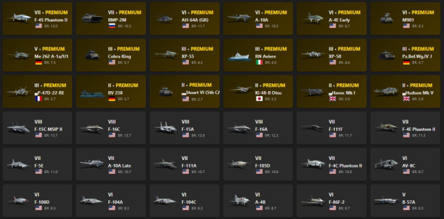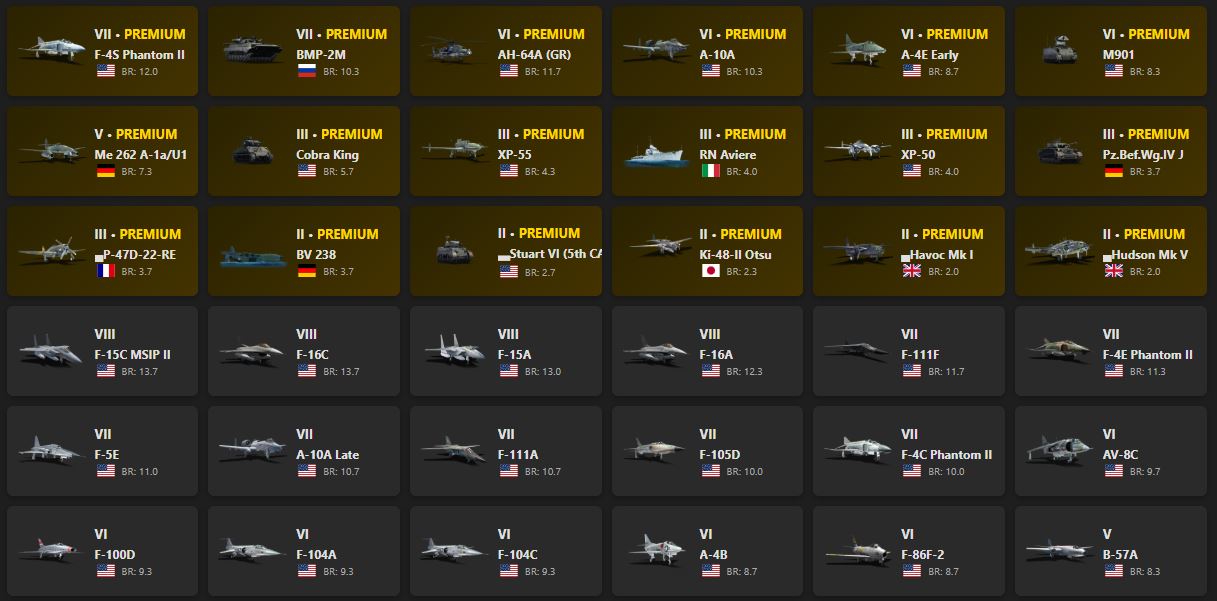 F-4S Phantom II, BMP-2M, AH-64A (GR), A-10A, A-4E Early, M901, Me 262 A-1a/U1, Cobra King, XP-55, RN Aviere, XP-50, Pz.Bef.Wg.IV J, ▄P-47D-22-RE, BV 238, ▃Stuart VI (5th CAD), Ki-48-II Otsu, ▄Havoc Mk I, ▄Hudson Mk V, F-15C MSIP II, F-16C, F-15A, F-16A, F-111F, F-4E Phantom II, F-5E, A-10A Late, F-111A, F-105D, F-4C Phantom II, AV-8C, F-100D, F-104A, F-104C, A-4B, F-86F-2, B-57A, B-57B, F-84F, UH-1B, AH-1G, F-86A-5, F-80C-10, F-84G-21-RE, F-80A-5, F-84B-26, F3D-1, B-29A-BN, M-51, P-51H-5-NA, BTR-ZD, AD-2, B-24D-25-CO, T-34-85, F-82E, A-26B-10, B-17G-60-VE, P-51D-30, Sakeen, IS-1, Panzer IV/70(V), Tiger H1, Panther D, PT-76B, T-34-85 (D-5T), Fw 190 D-9, M4A1 (76) W, M6A1, Me 264, VK 3002 (M), B-17E, KV-1 (ZiS-5), P-38L-5-LO, P-47D-28, PB4Y-2, T-34-57, ASU-57, B-26B, Do 335 A-1, Jagdpanzer IV, P-38J-15, P-47D-25, Su-6 (M-71F), Bf 109 F-4, Fw 190 A-4, Fw 190 A-5/U2, P-51D-5, P-61C-1, P-63A-10, P-63C-5, P-47D-22-RE, PBJ-1J, Wirbelwind, IL-2M (1943), Me 410 A-1, P-63A-5, KV-1S, M4A2, StuG III G, Sturer Emil, T-34 (1942), T-34E STZ, B-25J-1, B-25J-20, Dicker Max, KV-1 (L-11), KV-2 (1939), M24, P-51C-10, Pz.IV H, Pz.IV J, Sd.Kfz.234/2, B-34, F6F-5, M10 GMC, M4A1, Pz.IV F2, Sd.Kfz.251/21, T-34 (1940), ZiS-12 (94-KM), ZSU-37, Bf 109 E-4, F4U-1A (USMC), F4U-1D, IL-2 (1942), M4A3 (105), Marder III H, P-38E, Pz.III L, SB2C-1C, Sea Hurricane Mk IC, Spitfire Mk Ia, Spitfire Mk IIa, StuH 42 G, Yak-9, Yak-9B, A-20G-25, A-36, Bf 109 F-1, Bf 110 C-7, BTR-152A, Crusader II, F4U-1A, He 111 H-6, M3 Lee, M5A1, Me 410 A-1/U4, P-39N-0, Pe-3bis, Pz.III J1, T-50, Wellington Mk Ic/L, Yak-7B, Bf 109 E-1, Bf 109 E-3, Do 217 N-1, F4F-3, GAZ-MM (72-K), Hurricane Mk IIB/Trop, IL-2 (1941), Ju 88 C-6, Potez 630, T-80, Wellington Mk Ic, Yak-1, Fw 200 C-1, He 112 B-0, Hs 129 B-3, Hurricane Mk IV, Ju 88 A-1, Ju 87 D-3, P-400, PT-71, Sea Hurricane Mk IB, Sunderland Mk V, Sunderland Mk IIIa
