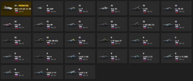 MiG-21S (R-13-300), Mi-4AV, La-9, Yak-3U, I-225, La-7B-20, Yak-3P, Yak-9P, La-7, Yak-9U, I-185 (M-71), Yak-3, Yak-9T, I-185 (M-82), La-5FN, I-16 type 27, La-5F, La-5, Yak-1B, Yak-9, LaGG-3-66, Yak-7B, LaGG-3-35, MiG-3-15 (BK), Yak-1, LaGG-3-11, LaGG-3-8
