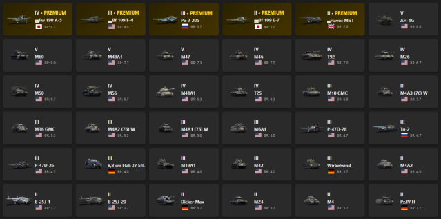 V - 4 Fw 190 A-5, Bf 109 F-4, Pe-2-205, Bf 109 E-7, Havoc Mk I, AH-1G, M60, M48A1, M47, M46, T92, M26