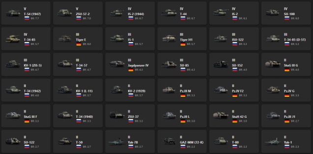 V - 2 T-54 (1947), ZSU-57-2, IS-2 (1944), T-44, IS-2, SU-100, T-34-85, Tiger E, IS-1, Tiger H1, ISU-122, T-34-85 (D-5T)