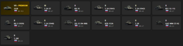 VII - 1 2S38, T-34-57, KV-1S, T-34 (1941), T-34 (1942), KV-1 (L-11), KV-2 (1939), T-34 (1940), ZiS-12 (94-KM), BTR-152A