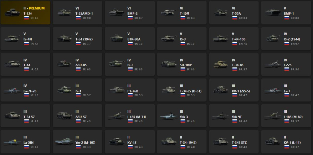 VI - 4, V - 6 T-55AMD-1, BMP-2, T-10M, T-55A, BMP-1, IS-4M, T-54 (1947), BTR-80A, IS-3, T-44-100, IS-2 (1944), T-44