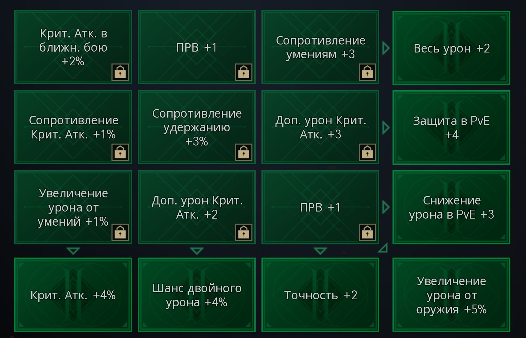 ℹ️ Другие Характеристики: Крит Атака 139%, Шанс Двойного Урона 67%, Шанс Тройного Урона 15%, Блокировка Оружия 46%, Увеличение Урона от Оружия 137%, Увеличение Урона от Умений 136%
