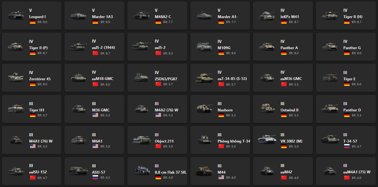 V - 4 Leopard I, Marder 1A3, M48A2 C, Marder A1-, leKPz M41, Tiger II (H), Tiger II (P), M109G