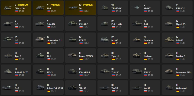 VI - 1, V - 7 Object 120, IS-6, Tu-1, ZSU-23-4V, Mi-4AV, ZSU-37-2, IS-3, T-44-100, ZSU-57-2