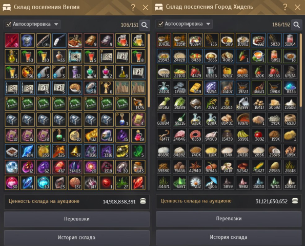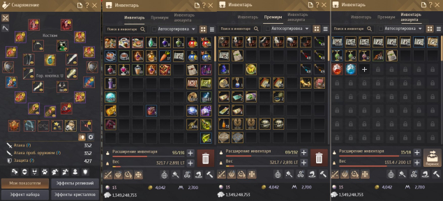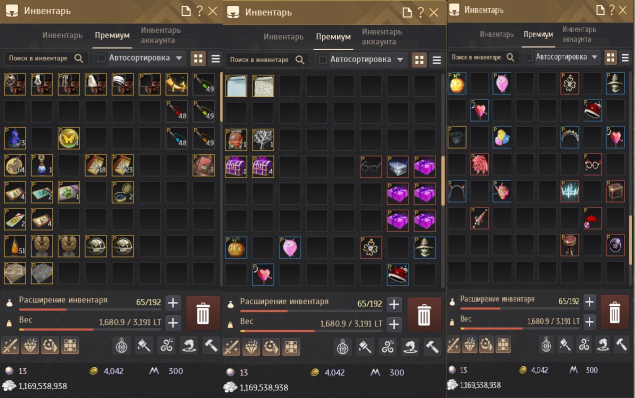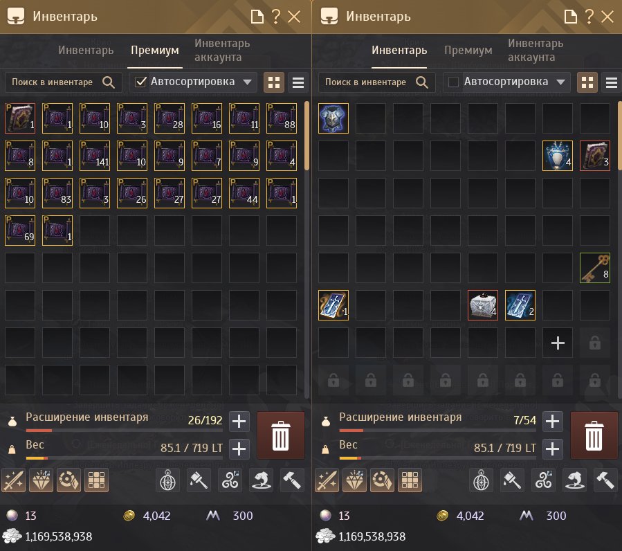 💼 Инвентарь забит, множество полезных предметов, прем-элиан 180д, Костюмы, 1к свитков, много складов расширено за донат, очки влияния раскиданы на добычу и производство паков, на всех мировых боссах присутствуют твинки в тувалле.Оч много горнечных итд.