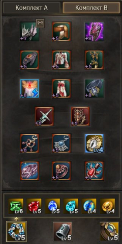 Шлем маны +5, Рукавицы оглушения +5, Сапоги уклонения +5, Символ фатальности +6, пуха +6, сет охотника +5, 6-й изумруд!
