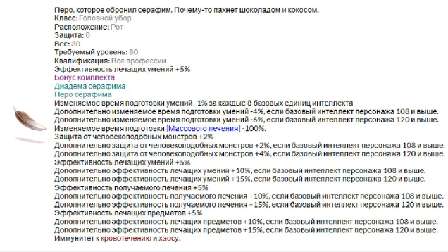 Дополнительно эффективность получаемого лечения +10%, если базовый интеллект персонажа 108 и выше.