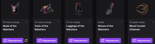 🔻 Mask of the Watchers (Маска Наблюдателей), 🔻 Tunic of the Watchers (Туника Наблюдателей), 🔻 Leggings of the Watchers (Поножи Наблюдателей), 🔻 Gloves of the Watchers (Перчатки Наблюдателей), 🔻 Blood Crystal Chakram (Чакрам из Кровавого Кристалла), 🔻 Gilded Oil Lamp (Позолоченная масляная лампа), 🔻 Blood Crystal Katana (Катана из Кровавого Кристалла)