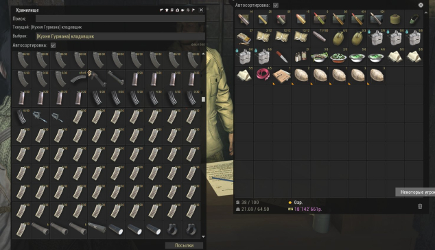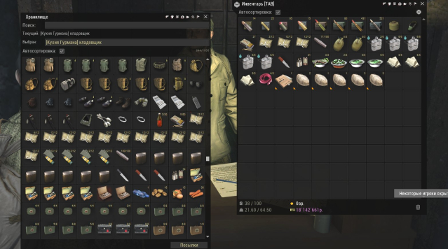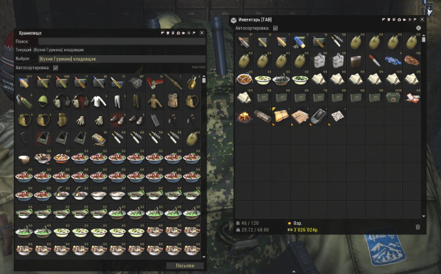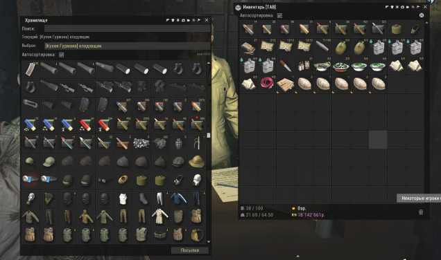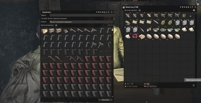 На втором персонаже (Из основного): 3.6кк, Разные патроны и одежда, Алиса с тентом сток, 3 МЗА, Куча еды, Много частей мутантов и животных, 224 сало, 56 металлических пластин, 71 короткая труба с резьбой, 970 оружейных масленок, 1175 обрезков проводов, 419 медной проволоки, 767 проводов в изоляции, разные лекарства, 66 пустой пробирки, Два набора старых инструментов, Два улучшенных набора инструментов, Две ремки для Ак-103/74м, Ремка для Акм/Акмс, Ремка для WA2000.