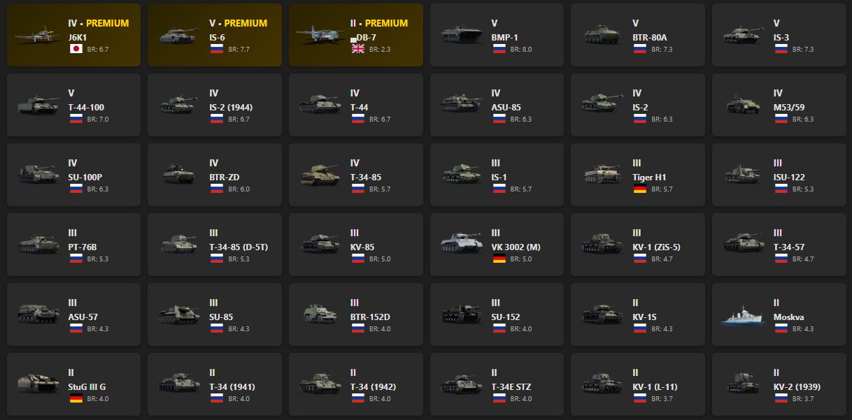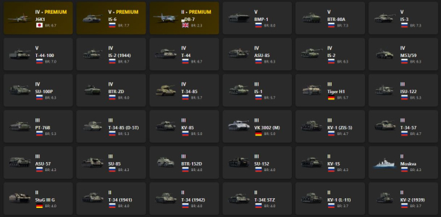 V - 5 J6K1, IS-6, BMP-1, BTR-80A, IS-3, T-44-100, IS-2 (1944), T-44, ASU-85, M53/59, BTR-ZD
