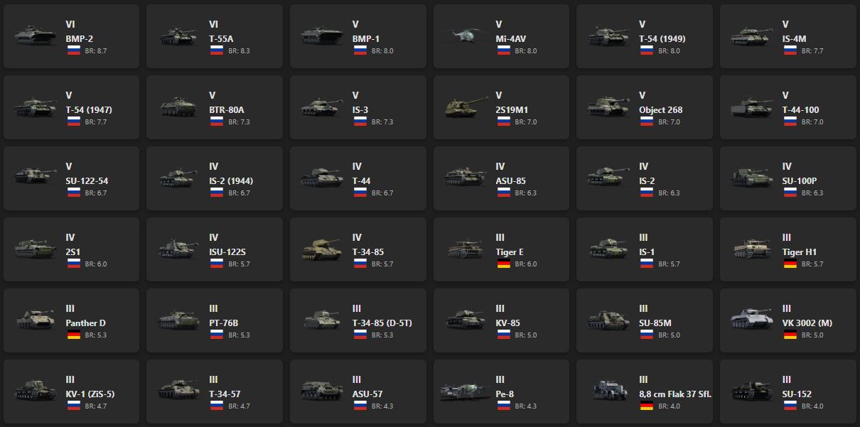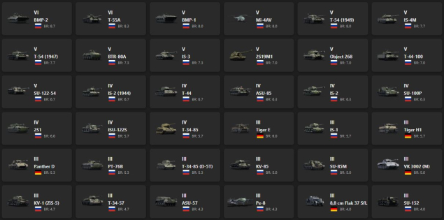VI - 2, V - 11 BMP-2, T-55A, BMP-1, Mi-4AV, T-54 (1949), IS-4M, T-54 (1947), BTR-80A, IS-3, 2S19M1, Object 268