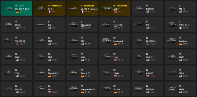VI - 1, V - 9 Me 262 A-1a/U1, XM800T, AH-1G, M163, T32, Object 268, T-44-100, T95, ZSU-57-2, SU-122-54