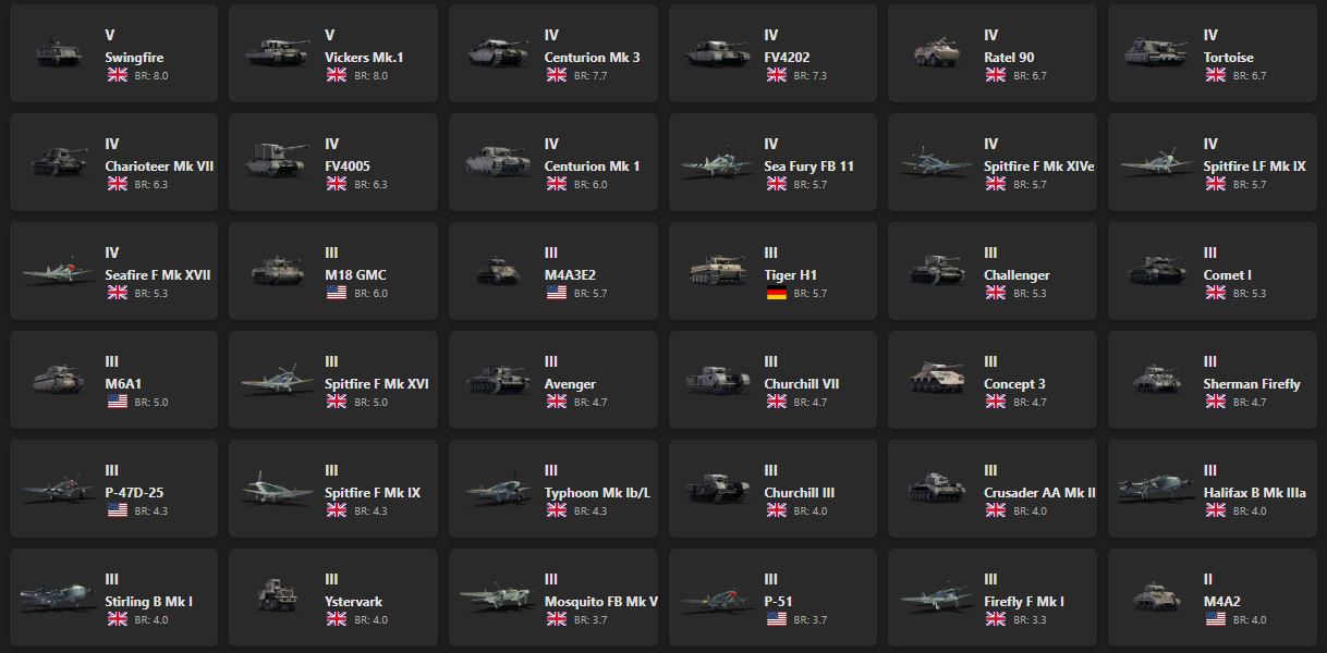 V - 2 Swingfire, Vickers Mk.1, Centurion Mk 3, FV4202, Ratel 90, Tortoise, Charioteer Mk VII, FV4005, Centurion Mk 1