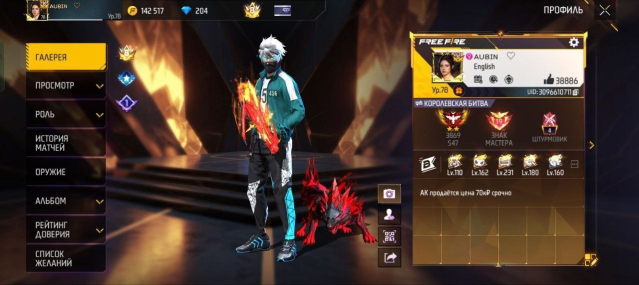 Подробное описание: Аккаунт со всеми вещами легендарные наборы есть все, галактика скорпион 🦂 все прокочены до фулла 3 пары штанов ангела 7 фулл эволюций а также 146 эмоции 15+ анимаций 3 превращения аккаунт 8 Прайма 346к+ алмазов затрачено