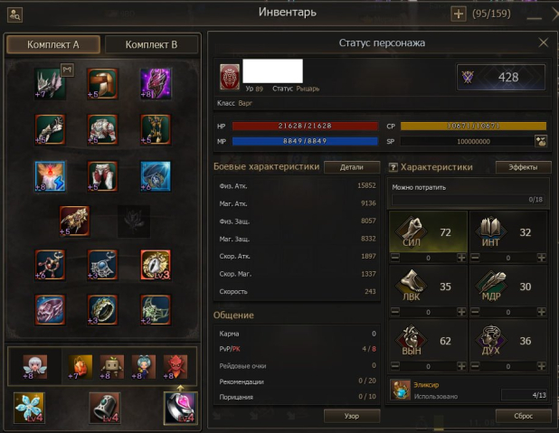 РБ ствол +5, Сет Охотника +5, Сапоги Уклонения +5, Шлем Маны +5, Перчатки Безмолвия +5